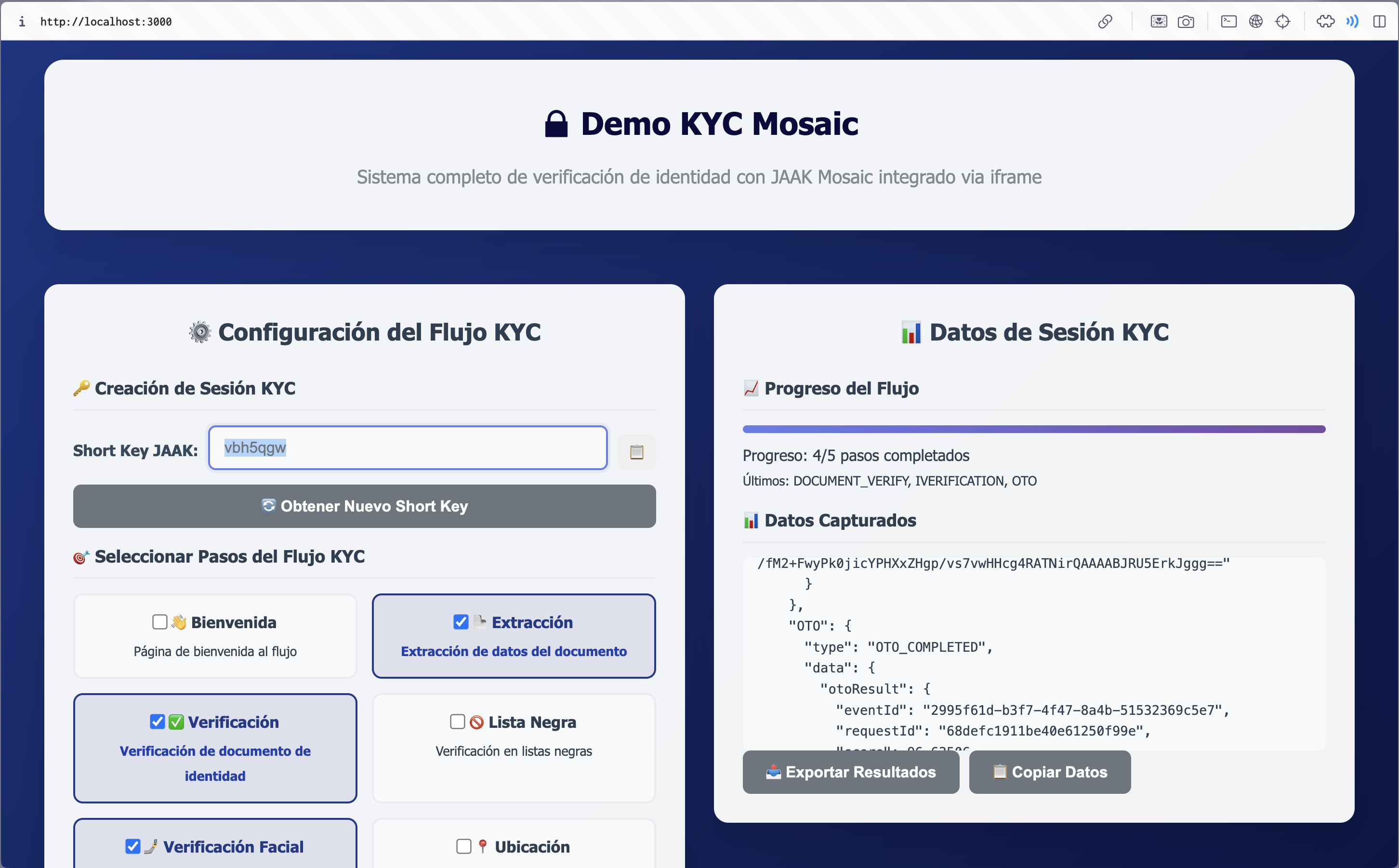 Has implementado exitosamente un sistema KYC embebido completo que replica la funcionalidad del Demo Embebido de JAAK Mosaic.